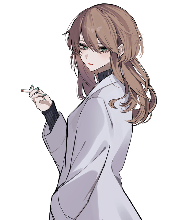 뒤돌아보면, 그곳에는 짧은 머리를 무심하게 묶고 가죽 재킷을 걸친 젊은 여성이 서 있다.